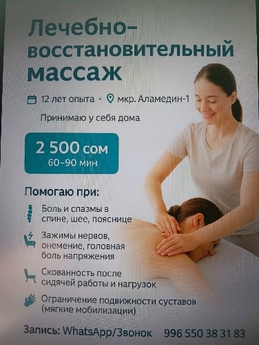 Мкр. Аламедин-1 • Принимаю у себя дома • Цена: 2 500 сомсеанс Ищу причину боли, а не просто «разминаю». Работаю с мышечными спазмами, защемлением нервов, головной болью напряжения, скованностью шеиплечпоясницы, онемением, ограничением подвижности после нагрузок и сидячей работы. Мягко улучшаю подвижность суставов (без жёстких «вправок»). Что вас ждёт на сеансе (60–90 мин): Диагностика: опрос, тесты подвижности, план работы. Комплекс техник: миофасциальный релиз, триггер-поинты, постизометрическая релаксация, классическийспортивный, лимфодренаж. Мягкие суставные мобилизации для снятия блоков и снятия зажатости. Индивидуально: расслабляющий или интенсивный, по вашим задачам. Гигиена и комфорт: одноразовые простыни, гипоаллергенные масла, уютная домашняя атмосфера. Почему 2 500 сом — это честная цена: 12 лет практики и выверенные протоколы → выше вероятность ощутимого облегчения за 1–3 сеанса (без гарантий, у каждого по-разному). До 90 минут личной работы «один на один» — не потоково. Экономия на таблетках и времени: работаем с причиной, а не маскируем симптомы. Удобство локации: мкр. Аламедин-1, быстро добраться, рядом парковка. Честная запись: не навязываю лишние процедуры — только то, что действительно нужно. Кому подойдёт: офисные сотрудники, спортсмены, водители, мамы с нагрузкой на спину, те, кто «застыл» в шее и пояснице, у кого стресс «зажал» плечи. Запись и вопросы: WhatsAppTelegram: [+183] Звонок: [+183] График: ежедневно 10:00– по предварительной записи. Важно: массаж — не замена врачу. При острых травмах, высокой температуре, дерматитах, беременности с рисками и т. п. сначала проконсультируйтесь со специалистом.