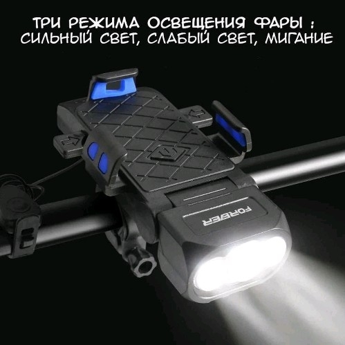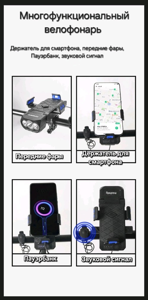Многофункциональный велосипедный фонарь: Держатель телефона с зарядкой на руль велосипеда 4 в 1 с функцией фонаря, пауэрбанка и гудка