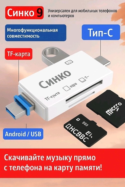 Многофункциональный кард‑ридер/OTG‑адаптер Синко 9 - Универсален для мобильных телефонов и компьютеров. - Поддержка Android/USB и разъёма Type‑C. - Разъёмы: USB, microUSB (OTG), Type‑C. - Слоты для карт: TF (microSD) и SD. - Совместимость с подключаемыми USB‑устройствами и флеш‑накопителями. - Позволяет скачивать музыку напрямую с телефона на карту памяти и передавать файлы между картами, телефоном и ПК.